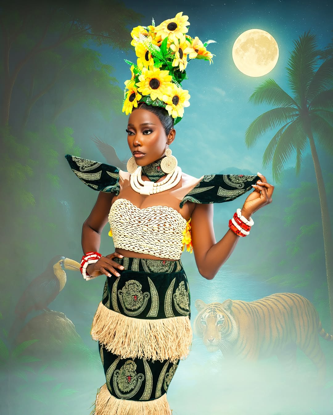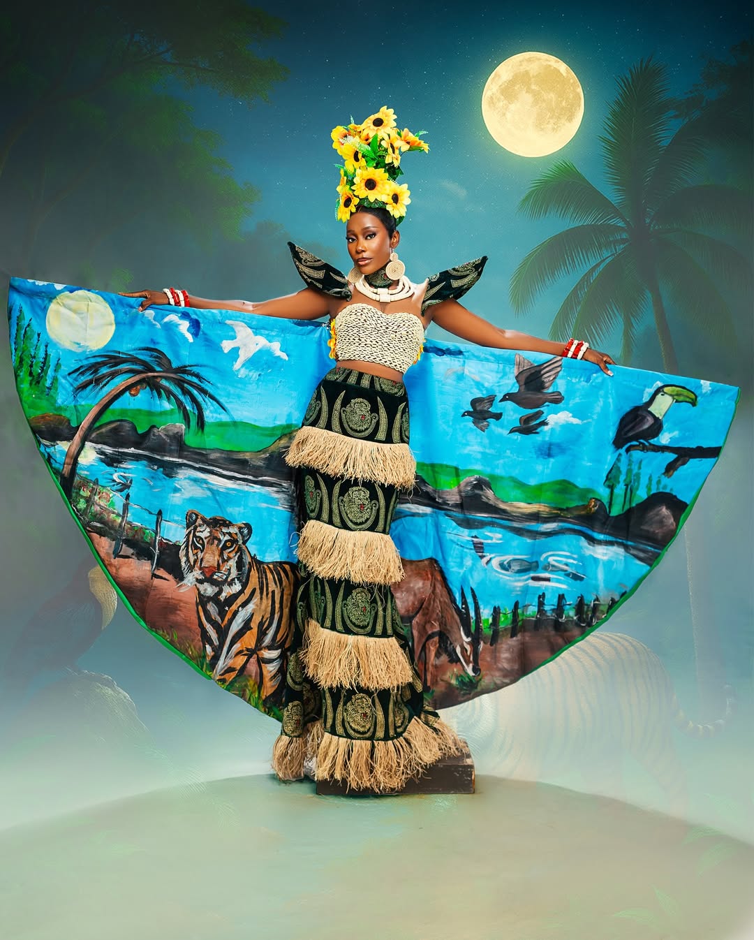 The Silhouette: The costume features a structured, raffia-fringed skirt layered with bold Isi Agu patterns, creating a silhouette that is both regal and grounded. The back piece, a magnificent hand-painted cape, depicts a lush Nigerian landscape teeming with wildlife—a tiger, a toucan, and soaring birds—reminding the world of the beauty we must protect.