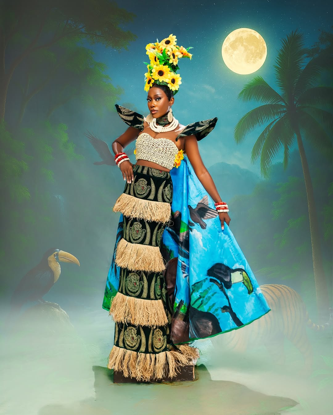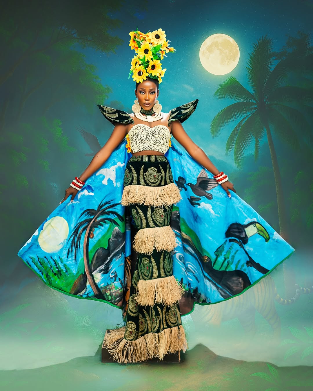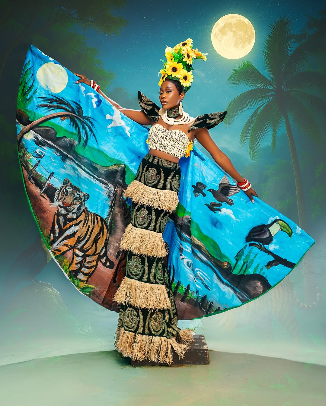 The Silhouette: The costume features a structured, raffia-fringed skirt layered with bold Isi Agu patterns, creating a silhouette that is both regal and grounded. The back piece, a magnificent hand-painted cape, depicts a lush Nigerian landscape teeming with wildlife—a tiger, a toucan, and soaring birds—reminding the world of the beauty we must protect.