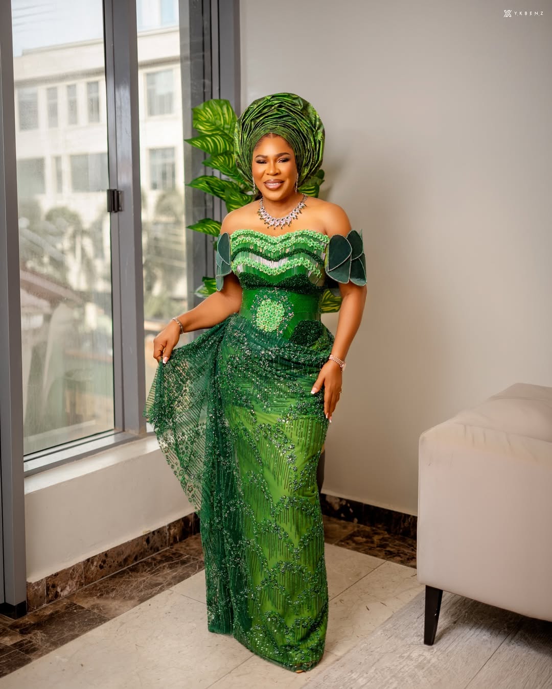 In a trio of stunning images captured by YKbenz Pixels, Williams radiates pure elegance. The custom-designed outfit is a testament to Nigerian haute couture, featuring an off-the-shoulder bodice intricately embellished with wavy bands of beading in multiple shades of green and silver.