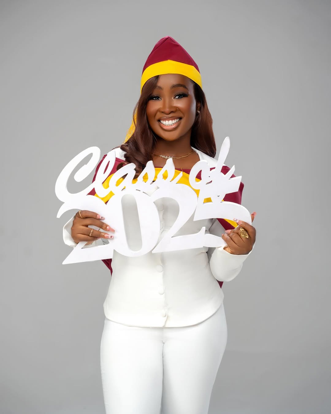 Jolaade Amodu, adorned in the university’s signature burgundy and gold regalia, has graduated with a First Class Honours degree in Finance, encapsulating her journey in photos and powerful words shared online: “Grateful for the journey, proud of the result.”