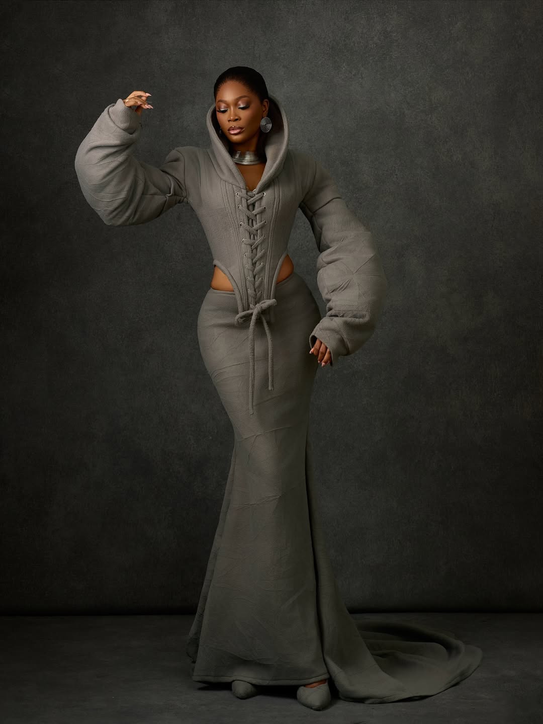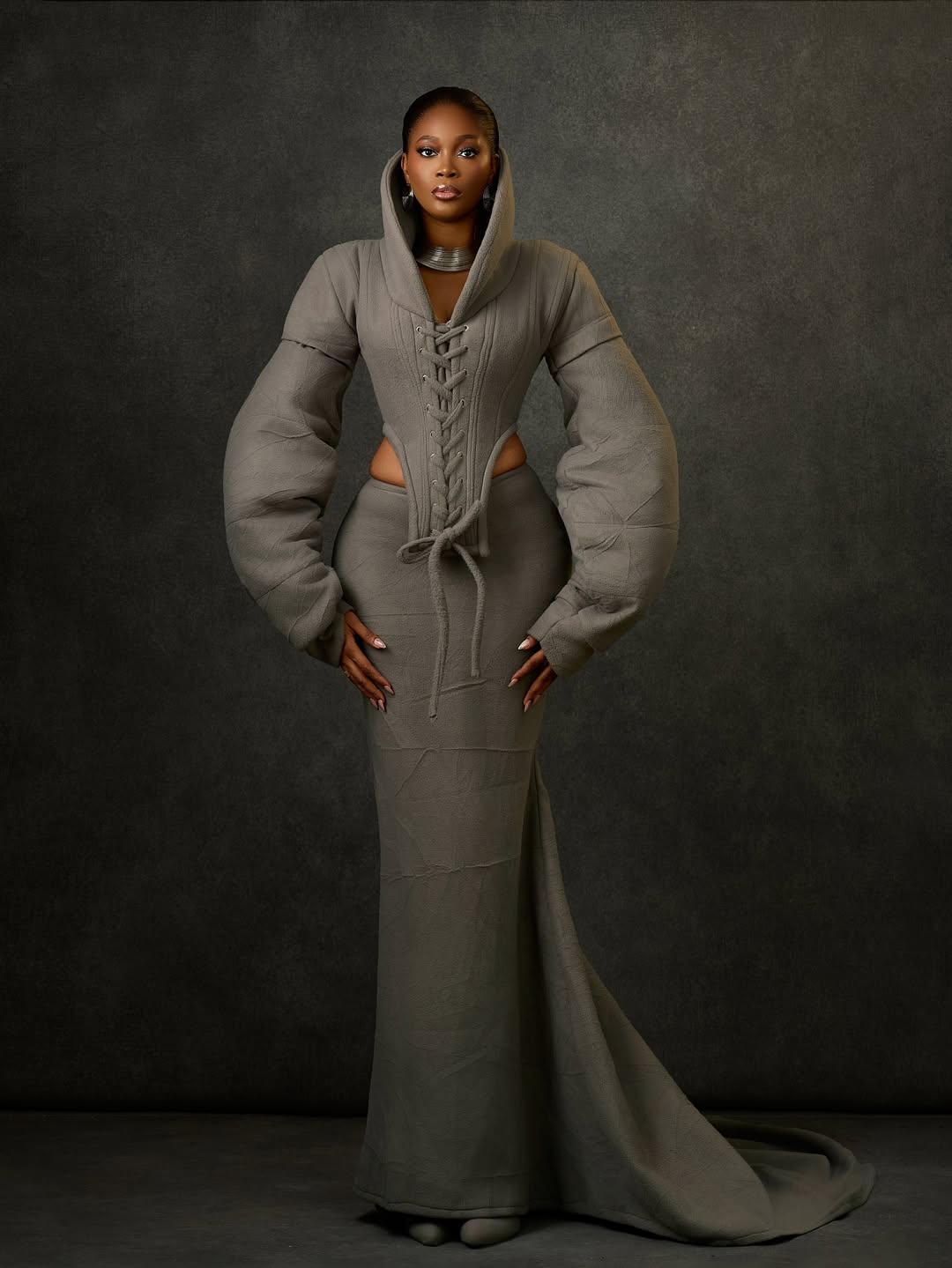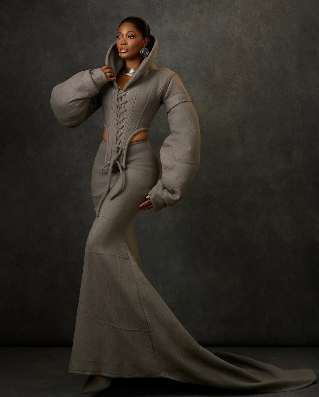 The images, shot by photographer Ibor Edosa Victor against a dramatic dark backdrop, showcase a sculptural taupe masterpiece.