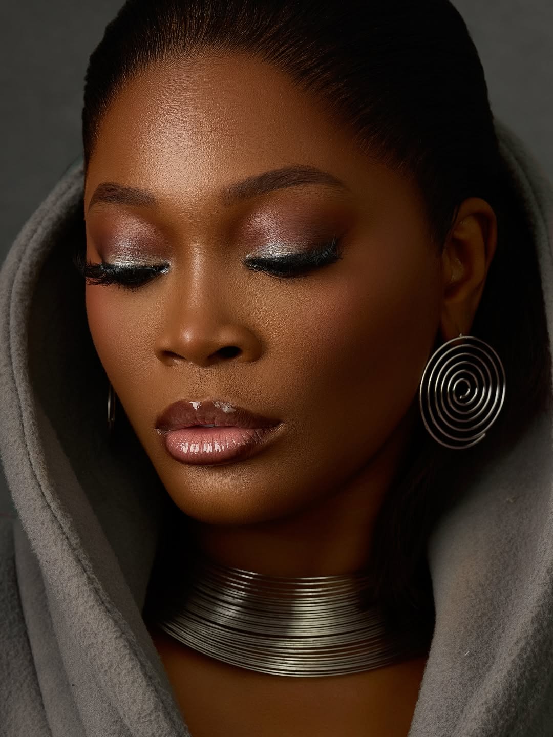 The complete creative team elevated the vision: Joy Ogugua of Tresses by Joy sculpted Kiekie’s sleek updo, makeup artist Ewatosin delivered a flawless complexion, and a statement silver choker and earrings added metallic contrast.