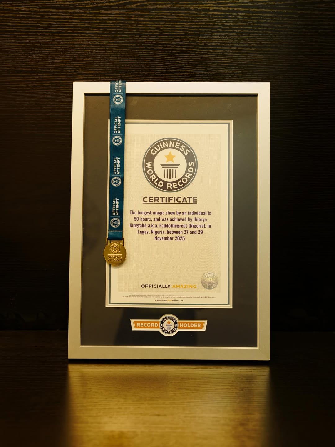 The record attempt took place from November 27 to 29, 2025, at the Landmark Centre in Victoria Island, Lagos, where he performed continuously for 50 hours—demolishing the previous record of 30 hours and 45 minutes set by British magician Richard Smith in 2004.