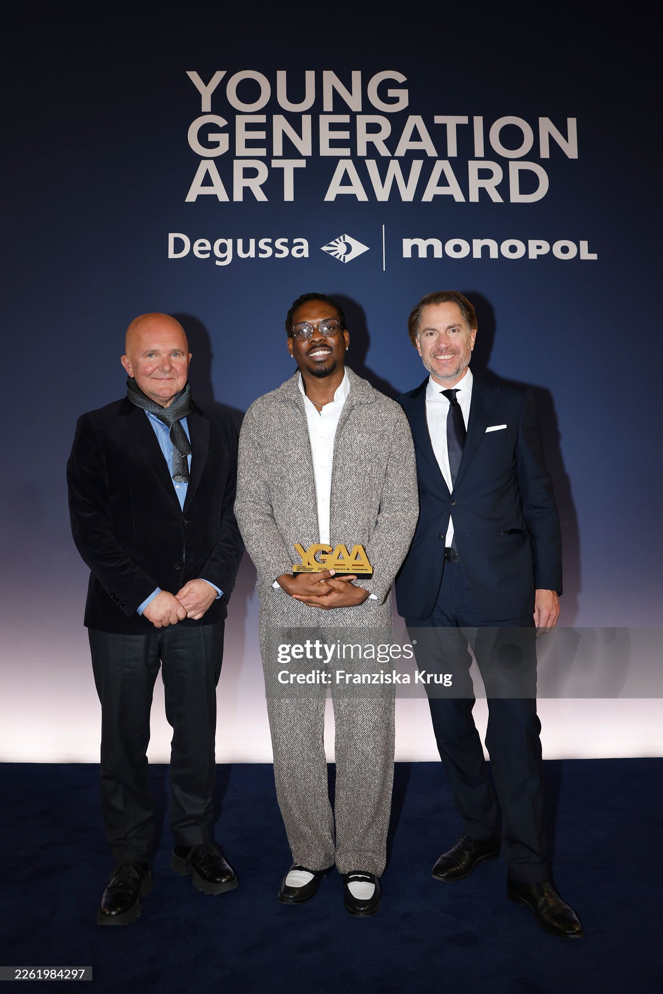 BERLIN, GERMANY – FEBRUARY 19: Christian Boros, Ken Nwadiogbu and Christian Rauch during the Young Generation Art Award 2026 at Hotel De Rome on February 19, 2026 in Berlin, Germany. (Photo by Franziska Krug/Degussa via Getty Images)