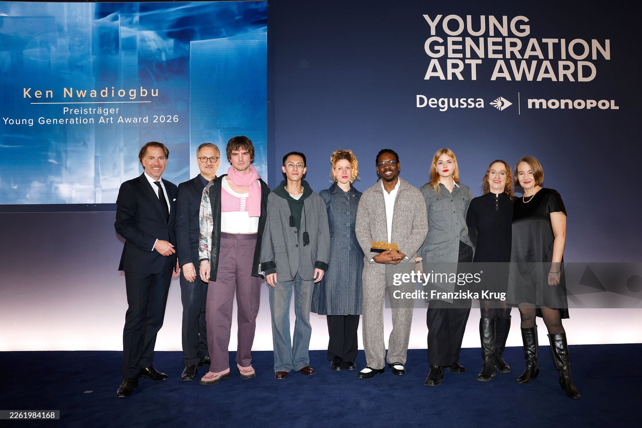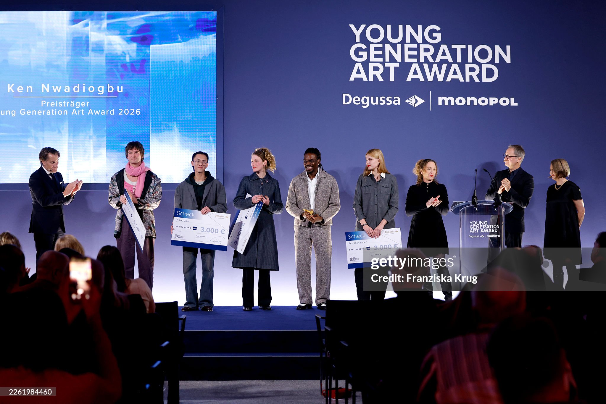 BERLIN, GERMANY – FEBRUARY 19: Arne Grashoff, Yuhao Chen, Lunita July Dorn, Ken Nwadiogbu, Emmélie Lempert, Maya Heckelmann, Yilmaz Dziewior and Elke Buhr during the Young Generation Art Award 2026 at Hotel De Rome on February 19, 2026, in Berlin, Germany. (Photo by Franziska Krug/Degussa via Getty Images)
