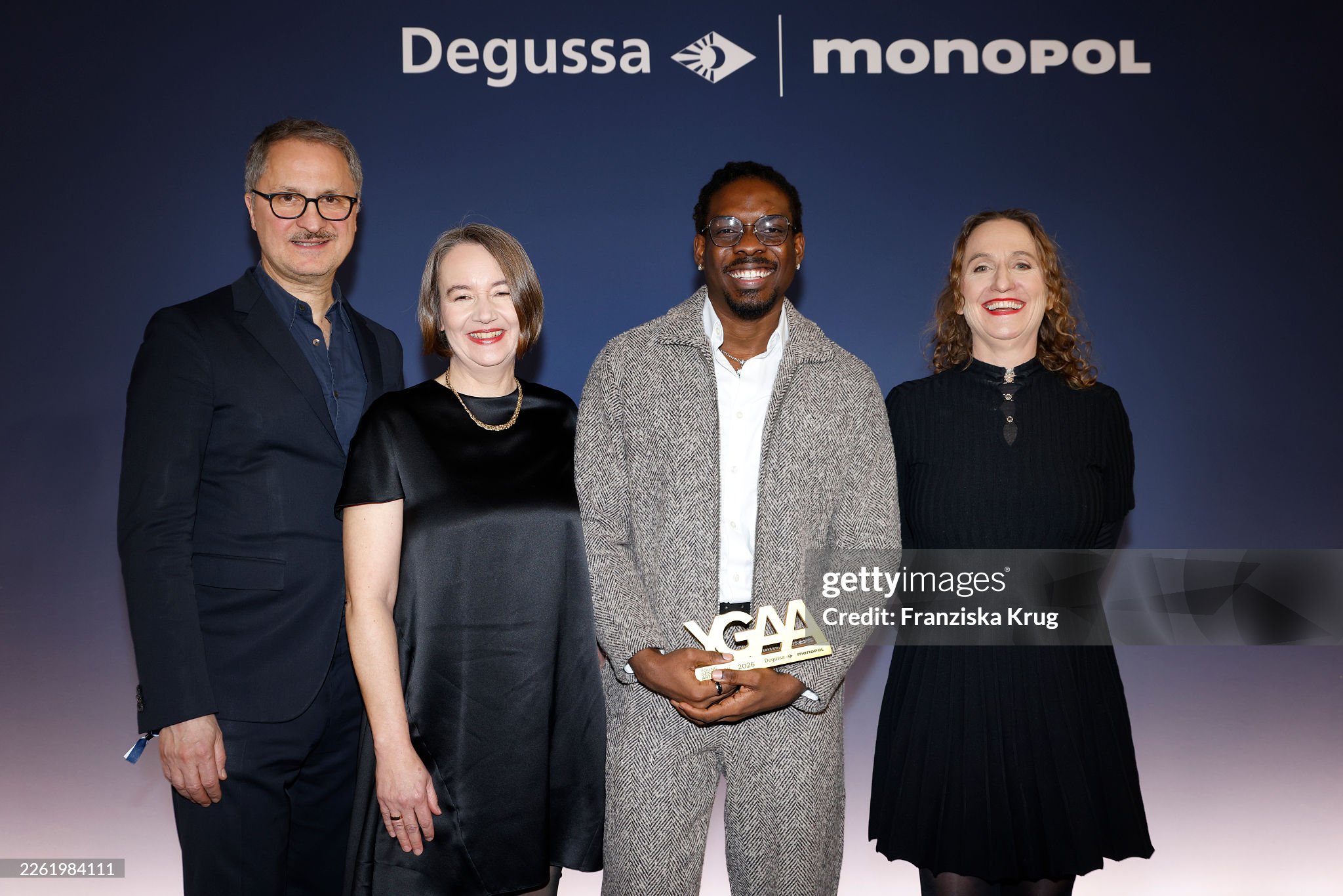 BERLIN, GERMANY – FEBRUARY 19: Yilmaz Dziewior, Elke Buhr, Ken Nwadiogbu and Maya Heckelmann during the Young Generation Art Award 2026 at Hotel De Rome on February 19, 2026 in Berlin, Germany. (Photo by Franziska Krug/Degussa via Getty Images)
