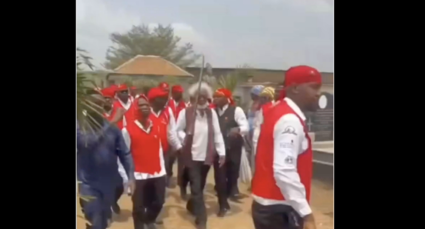 Video footage captured the iconic moment showing Soyinka, a founding father of the confraternity, spearheading members clad in their signature red attire as they gyrated with symbolic swords to pay tribute to their departed colleague.